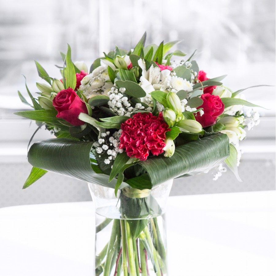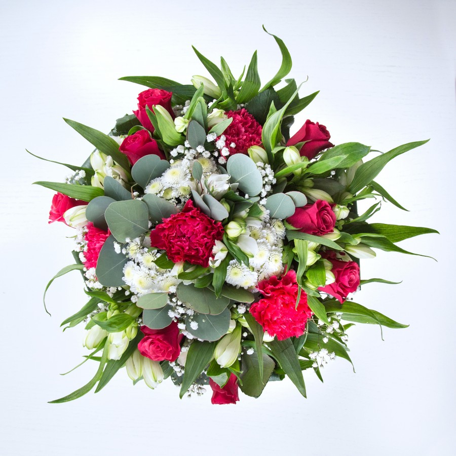 Embrace tranquility with our Serene Beauty Bouquet. This stunning arrangement combines the deep hues of red roses with the delicate charm of white chrysanthemums and gypsophila, enhanced by white alstroemeria and aspidistra leaves for a unique and captivating design.
